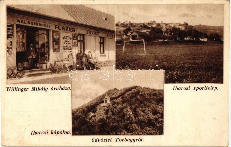 Leírás: Torbágy, Biatorbágy; Iharosi sporttelep és kápolna, Willinger Mihály áruháza, kiadja Wokaun fényképész (ázott sarok / wet corner)
