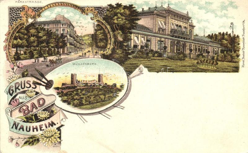 Leírás: Bad Nauheim, Münzenberg, Parkstrasse, Kunstanstalt Rosenblatt, floral, Art Nouveau litho