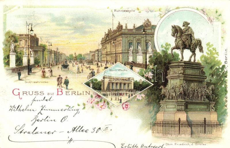 Leírás: Berlin, Schlossbrücke, Ruhmeshalle, Denkmal Friedrich d. Grosse / castle bridge, hall, statue, floral, litho (EK)