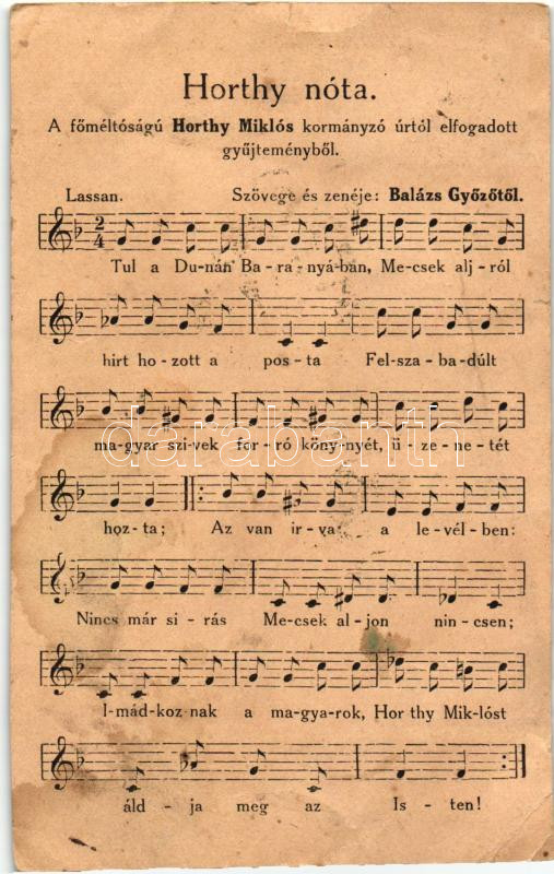 Horthy nóta / Hungarian propaganda sheet music (b) https://www.darabanth.com/hu/266-Gyorsarveres/266.0/Kepeslapok/Propaganda-politika~300109/Horthy-nota-Hungarian-propaganda-sheet-music-b~II1317135