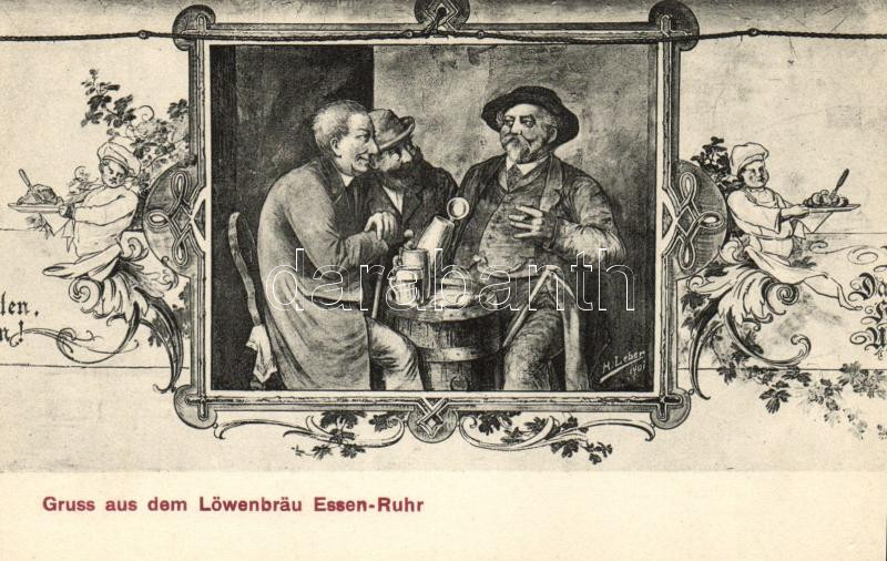 Leírás: Gruss aus dem Löwenbräu Essen-Ruhr / beer advertisement, drinking men s: H. Leben