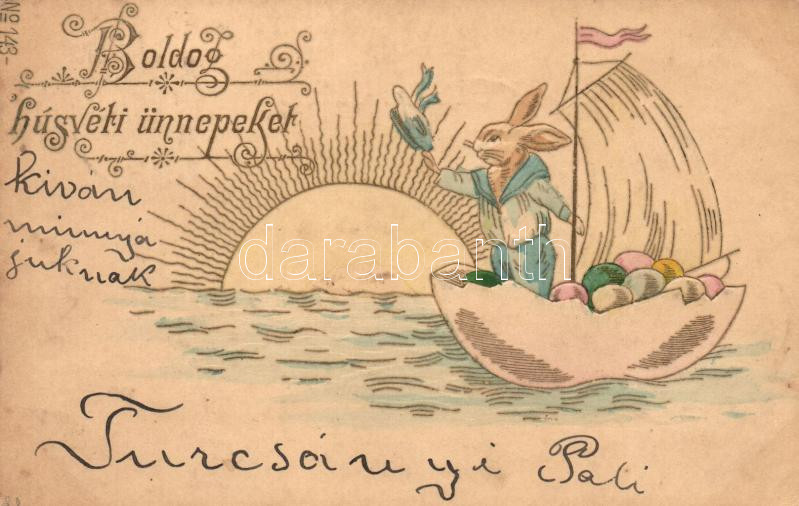 Easter, Rabbit sailor, sailing egg boat, Emb. https://www.darabanth.com/hu/266-Gyorsarveres/266.0/Kepeslapok/Udvozlolapok-Unnepek~300078/Easter-Rabbit-sailor-sailing-egg-boat-Emb~II1215064