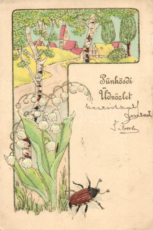 Pünkösdi üdvözlet / Pentecost, lily of the valley, may bug, Emb. https://www.darabanth.com/hu/266-Gyorsarveres/266.0/Kepeslapok/Udvozlolapok-Unnepek~300078/Punkosdi-udvozlet-Pentecost-lily-of-the-valley-may-bug-Emb~II1315390