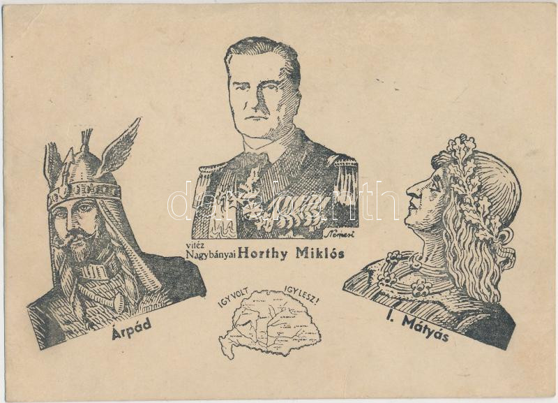 Így volt, így lesz!; Árpád, Horthy Miklós, I. Mátyás, irredenta (EK) https://www.darabanth.com/hu/266-Gyorsarveres/266.0/Kepeslapok/Uralkodo-Politikus~300082/Igy-volt-igy-lesz-Arpad-Horthy-Miklos-I-Matyas-irredenta-EK~II1316909