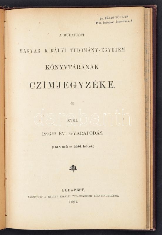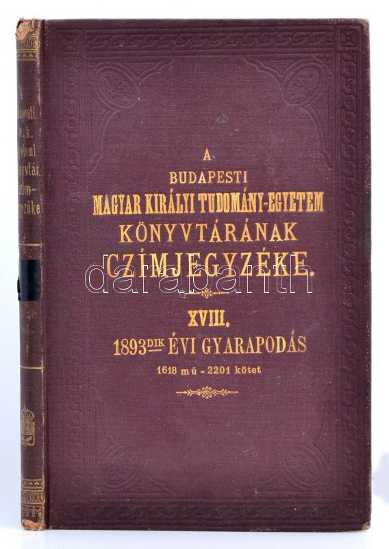 A Budapesti Kir. Magy. Tudomány- Egyetem könyvtárának czímjegyzéke. XVIII. 1893.-dik évi gyarapodás. (1618 mű- 2201 kötet.)