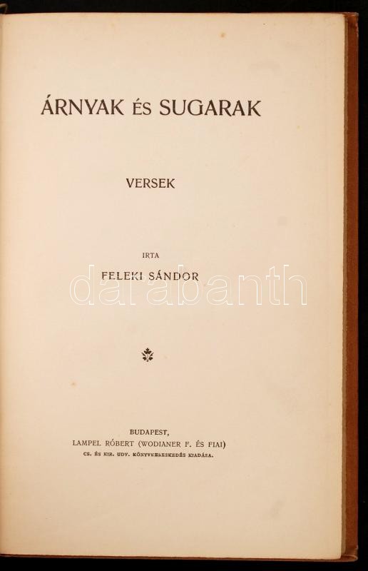 Feleki Sándor: Árnyak és sugarak. Versek. Bp., [1903], Lampel. A szerző által Thék Endre (1842-1919) bútorasztalos, bútorgyáros részére dedikálva. Kicsit kopott, díszes, festett vászonkötésben, egyébként jó állapotban.