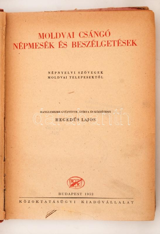 Leírás: Hegedűs Lajos: Moldvai csángó népmesék és beszélgetések. Népnyelvi szövegek moldvai telepesektől. Budapest, 1952, Közoktatásügyi Kiadóvállalat. Kissé laza gerincű illusztrált kemény kötésben.