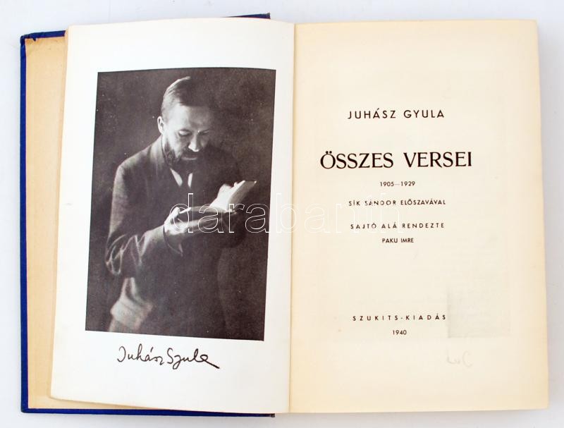 Juhász Gyula összes versei. 1905-1929. Sík Sándor előszavával. Sajtó alá rendezte Paku Imre. 1. köt. Szeged, 1940, Szukits. 1 t. VIII, 384 p. Aranyozott kiadói egészvászon-kötésben, a gerince kissé kopottas. Első összkiadás, a kötetben megjelent verseket tartalmazza. 1941-ben megjelent egy második kötet, amely a kötetbe nem rendezett verseket gyűjtötte egybe.