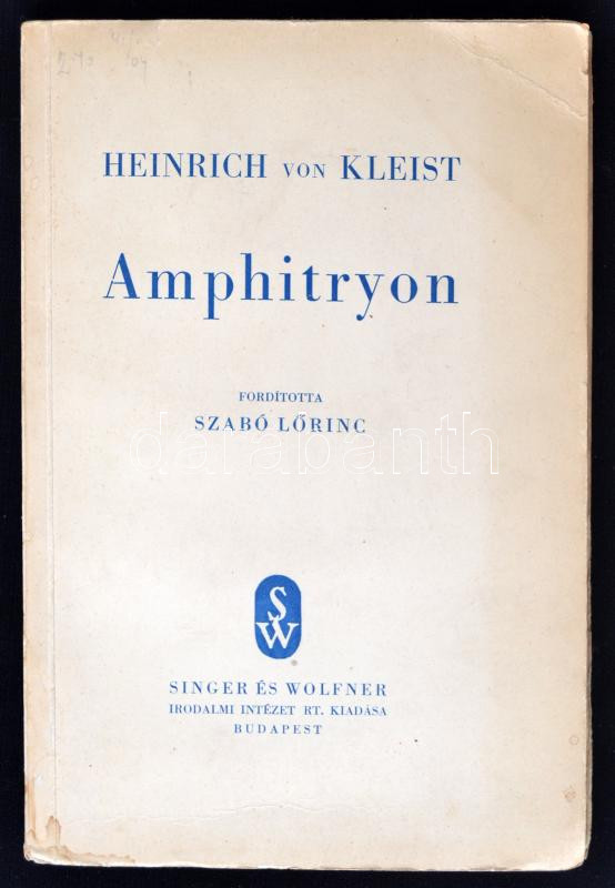 Leírás: Kleist, Heinrich von: Amphitryon. Vígjáték Moliere nyomán. Fordította Szabó Lőrinc. Bp., 1939, Singer és Wolfner. 97 p. Kiadói papírborítóban. Körülvágatlan példány.