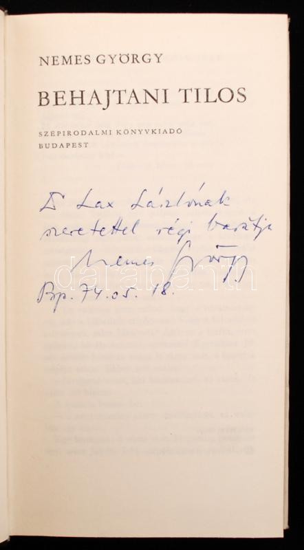 Nemes György: Behajtani tilos. Bp., 1974, Szépirodalmi. Kiadói egészvá... https://www.darabanth.com/hu/266-Gyorsarveres/266.0/Konyvek/Konyvek-Egyeb-ritkasagok~500026/Nemes-Gyorgy-Behajtani-tilos-Bp-1974-Szepirodalmi-Kiadoi-egeszvaszon-kotesben-dr-Lax-~II1330894