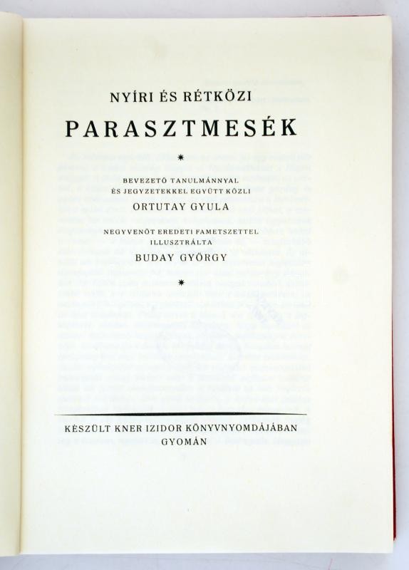 Leírás: Ortutay Gyula:Nyíri és rétközi parasztmesék. Buday György fametszeteivel. Gyoma, Kner Izidor. Reprint kiadás. Félvászon kötésben