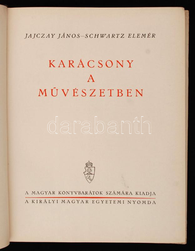 Jajczay János - Schwartz Elemér: Karácsony a művészetben Bp., 1942, Kir. M. Egyetemi Ny. 255 p, CXXVIII t. Aranyozott gerincű kiadói félvászonkötésben.