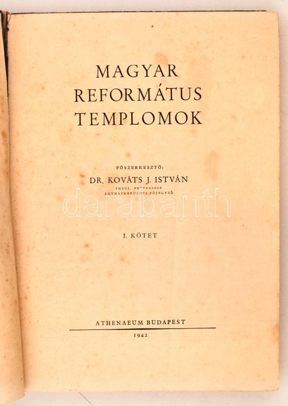 Magyar református templomok. I. kötet. Főszerkesztő: Dr. Kováts J. István. Bp., 1942. Athenaeum. Viseletes állapotban, a gerincvászon hiányos, felszakadt, a kötés laza.