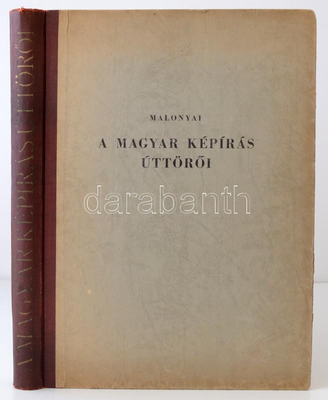 Malonyai Dezső: A magyar képírás úttörői. Negyvenkilenc képmelléklettel és négy facsimilével. A kezdőlapokat és záródíszeket rajzolta Nagy Sándor. Bp. 1905. Franklin Társ. 4 sztl. lev. 120 l. 49 t. Kiadói félvászonkötésben. A négy facsimile hiányzik. A borítótáblák enyhén sérültek.