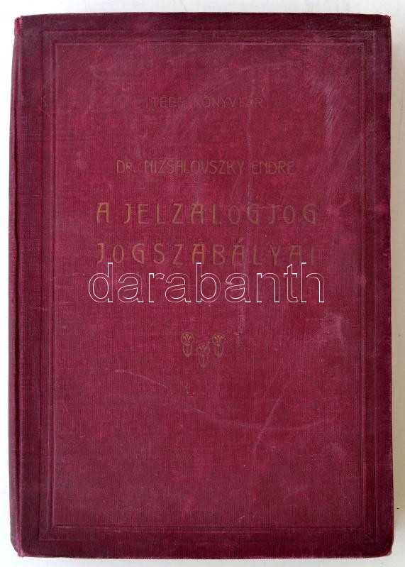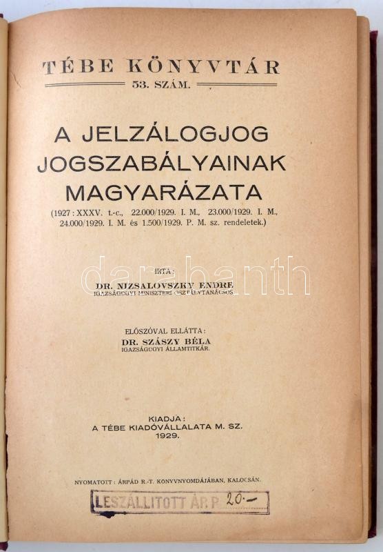 Nizsalovszky Endre: A jelzálogjog jogszabályainak magyarázata. Bp., 1929, Tébe Kiadóvállalata (Tébe könyvtár 53.). Kissé kopott vászonkötésben, egyébként jó állapotban.