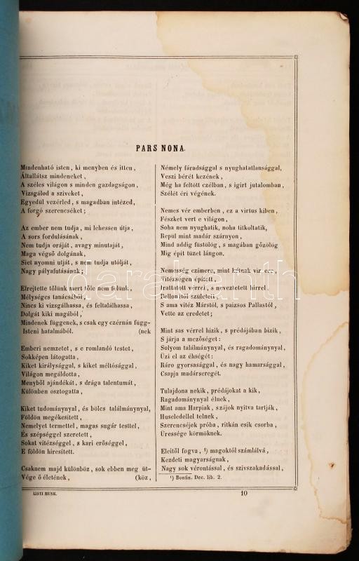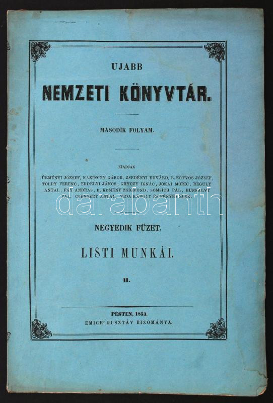 Ujabb Nemzeti Könyvtár. Második folyam. Negyedik füzet. Liszti munkái II. Pesten, 1853, Emich Gusztáv. Eredeti kiadói papírkötésben, jobb sarkában ázásnyommal.