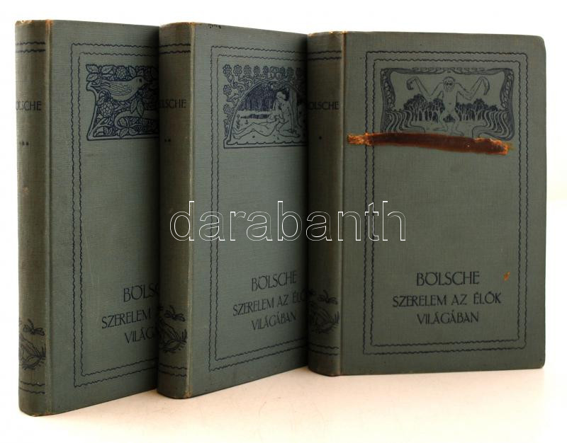 Bölsche Vilmos: Szerelem az élők világában. A szerelem fejlodéstörténete és földi vándorútja. I-III. Bp., 1910, Politzer Zsigmond és fia. Kiadói illusztrált, élfestett egészvászon-kötésben