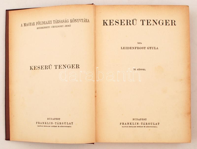 A Magyar Földrajzi Társaság Könyvtára: Leidenfrost Gyula: Keserű tenger Bp. é.n. Franklin. Aranyozott, kiadói egészvászon kötésben. Gerinc kissé kopott, egyébként szép állapotban.