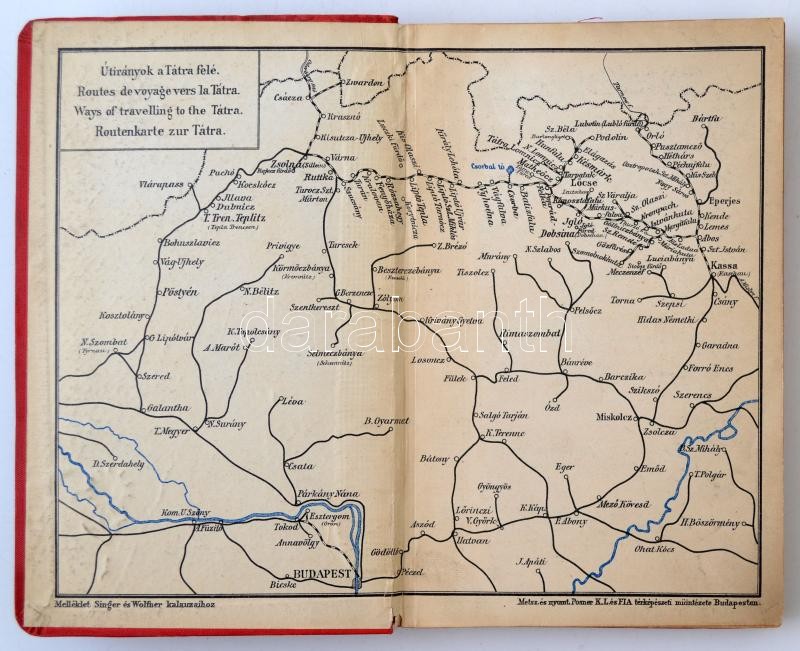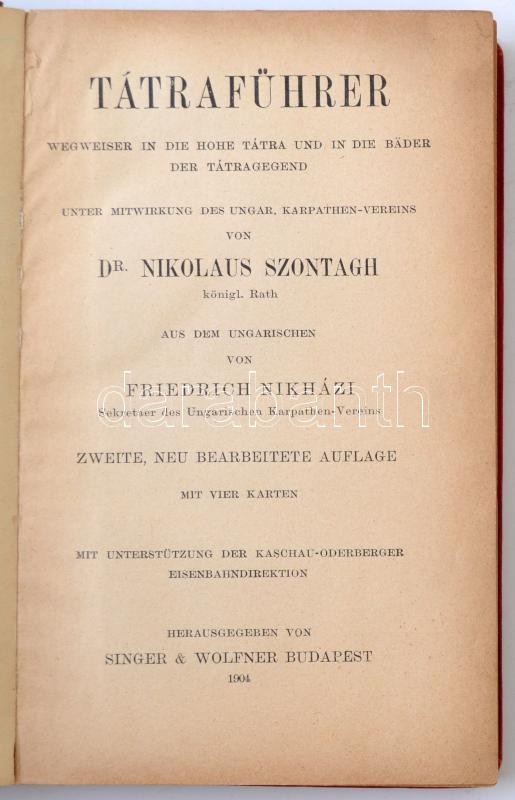 Szontagh, Nikolaus: Tátra Führer. Wegeweiser in die Hohe Tátra und in die Bäder der Tátragegend. Bp., 1904, Singer és Wolfner (Singer-Wolfner's Reisehandbücher). A négyből két térképmelléklettel. Kissé kopott díszes vászonkötésben, egyébként jó állapotban.