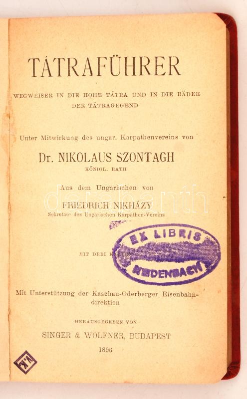 Szontagh, Nikolaus: Tátraführer. Wegeweiser in die Hohe Tátra und in die Bäder der Tátragegend. Budapest, 1896, Singer & Wolfner (Singer-Wolfner's Reisehandbücher). A háromból egy térképmelléklettel. Kissé megviselt vászonkötésben.