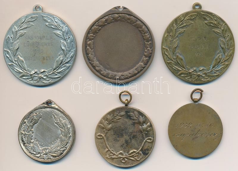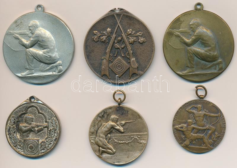 Leírás: 6db-os lövész díjérem tétel, benne Madarassy Walter (1909-1994) 1932. "Budapesti IV. Kerületi Bulcsu Polgári Lövész Egyesület" T:2,2-