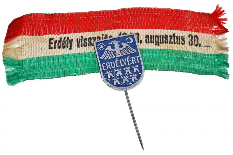 Leírás: ~1930. "Erdélyért" irredenta festett alumínium kitűző "Erdély visszajön 1940. augusztus 30." feliratú nemzetiszín szalagon T:2