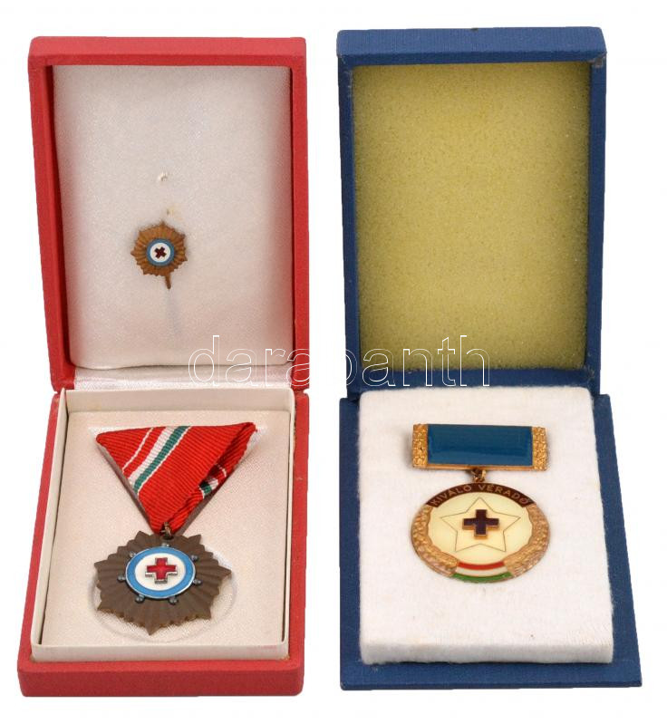 Leírás: ~1970-1980. "Kiváló véradó" aranyozott, zománcozott fém kitüntető jelvény dísztokban + "Vöröskeresztes munkáért" bronz fokozata mellszalagon, miniatűrrel, tokban T:2