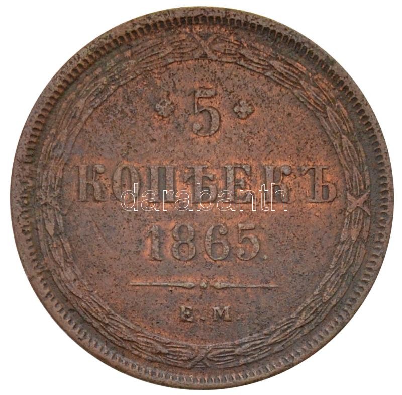 Russian Empir... https://www.darabanth.com/hu/266-Gyorsarveres/266.0/Numizmatika/Kulfoldi-fem-es-ezustpenzek~500012/Orosz-Birodalom-1865-5k-Cu-II-Sandor-T2---Russian-Empire-1865-5-Kopeks-Cu-Alexander-II-CVF~II1332158