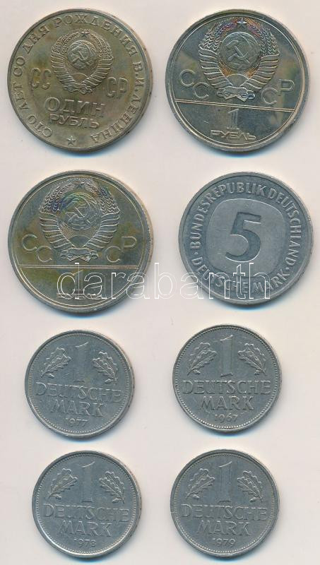 Mixed: Soviet Union 1970,1977,1979. 1 Rouble Cu-Ni-Zn (3x) + FRG / Germany 1967-1978. 1 Mark (4x) + 1993F 5 Mark C:XF