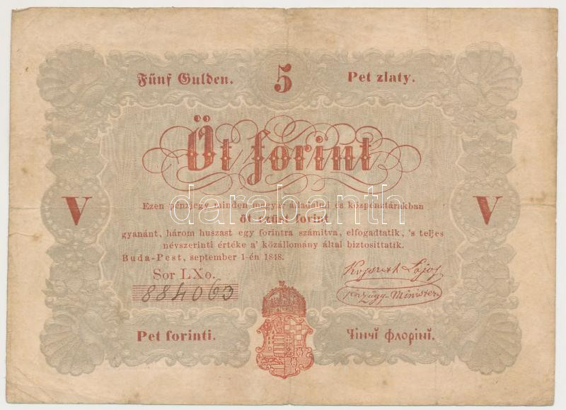 1848. 5Ft "Kossuth bankó" vörösesbarna T:III https://www.darabanth.com/hu/266-Gyorsarveres/266.0/Numizmatika/Magyar-bankjegyek~500022/1848-5Ft-Kossuth-banko-vorosesbarna-TIII~II1332268