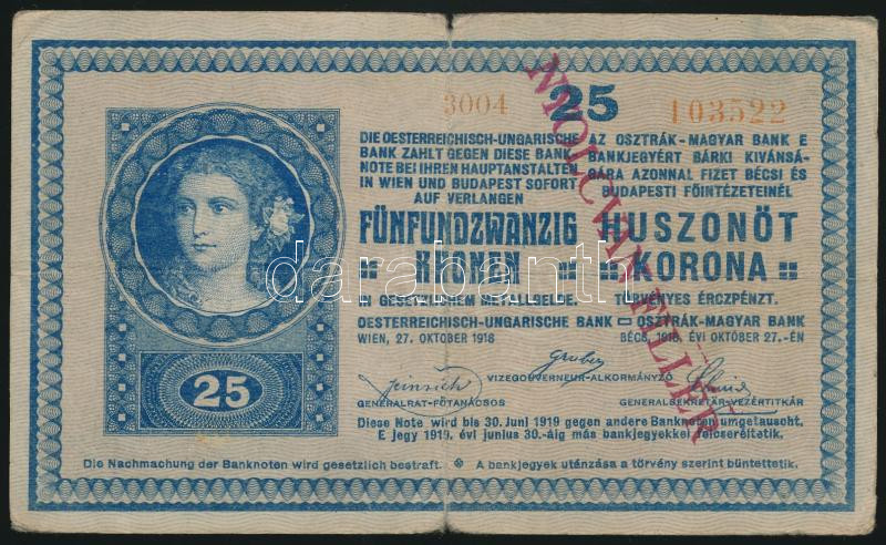 1918. 25K "3004" 3mm sima hátlappal, ismeretlen eredetű &quo... https://www.darabanth.com/hu/266-Gyorsarveres/266.0/Numizmatika/Magyar-bankjegyek~500022/1918-25K-3004-3mm-sima-hatlappal-ismeretlen-eredetu-NYOLCVAN-FILLER-felulbelyegzessel-T~II1335047