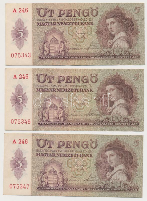 1939. 5P (3x) sorszámkövető és egyugrású sorszámokkal T:II- https://www.darabanth.com/hu/266-Gyorsarveres/266.0/Numizmatika/Magyar-bankjegyek~500022/1939-5P-3x-sorszamkoveto-es-egyugrasu-sorszamokkal-TII-~II1332714