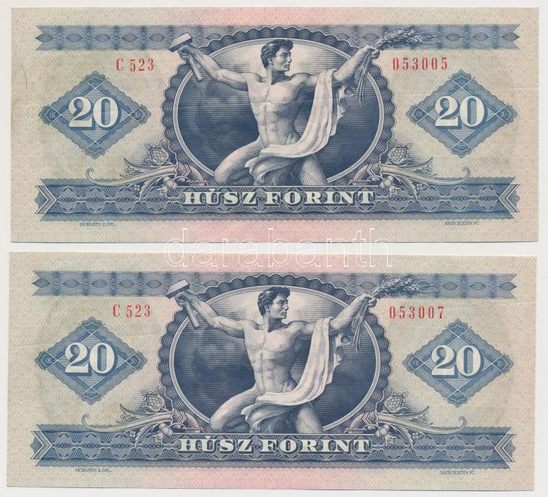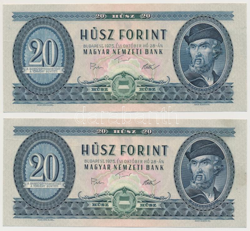 1975. 20Ft (2x) egyugrású sorszámokkal T:I- fo. https://www.darabanth.com/hu/266-Gyorsarveres/266.0/Numizmatika/Magyar-bankjegyek~500022/1975-20Ft-2x-egyugrasu-sorszamokkal-TI-fo~II1334989