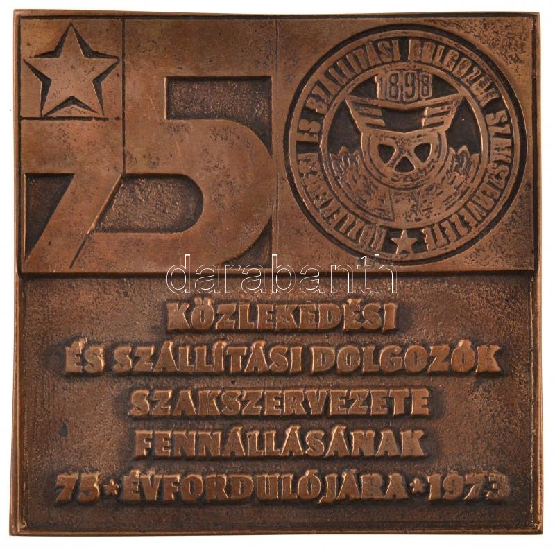 Leírás: 1973. "Közlekedési és Szállítási Dolgozók Szakszervezete fennállásának 75. évfordulójára" kétoldalas Br plakett dísztokban (93x92mm) T:2