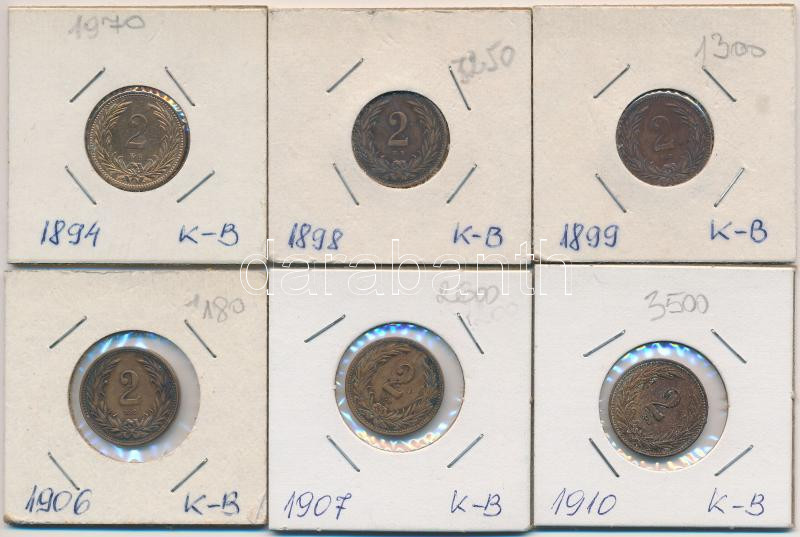 1894-1910KB 2f Br (6xklf), közte 1907KB T:2,2- https://www.darabanth.com/hu/266-Gyorsarveres/266.0/Numizmatika/Magyar-es-magyar-verdejelu-fem-es-ezustpenzek~500008/1894-1910KB-2f-Br-6xklf-kozte-1907KB-T2-2-~II1335866