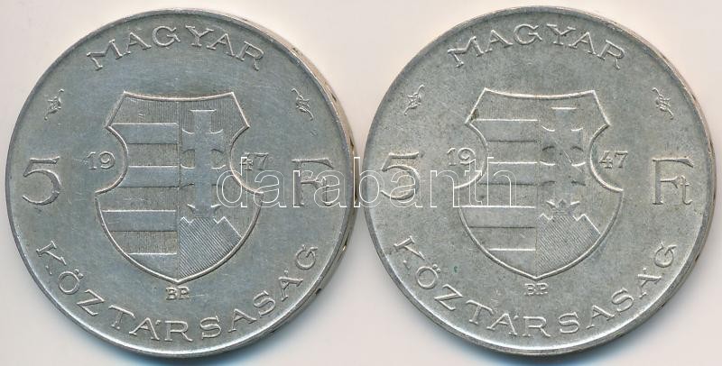 1947. 5Ft Ag "Kossuth" (2x) T:2,2- https://www.darabanth.com/hu/266-Gyorsarveres/266.0/Numizmatika/Magyar-es-magyar-verdejelu-fem-es-ezustpenzek~500008/1947-5Ft-Ag-Kossuth-2x-T2-2-~II1334475