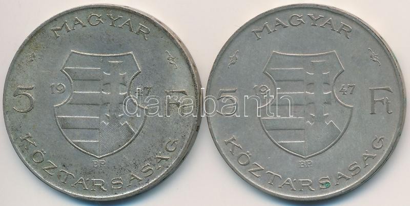 1947. 5Ft Ag "Kossuth" (2x) T:2-,3 https://www.darabanth.com/hu/266-Gyorsarveres/266.0/Numizmatika/Magyar-es-magyar-verdejelu-fem-es-ezustpenzek~500008/1947-5Ft-Ag-Kossuth-2x-T2-3~II1334459