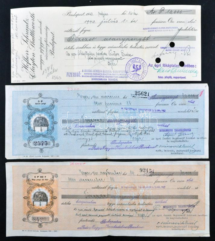 Budapest / Eger 1940. Az Egri Főkáptalan és az Egyházmegyei Takarékpénztár Részvénytársaság 3db klf kitöltött váltója illetékbélyegekkel, bélyegzésekkel T:III
