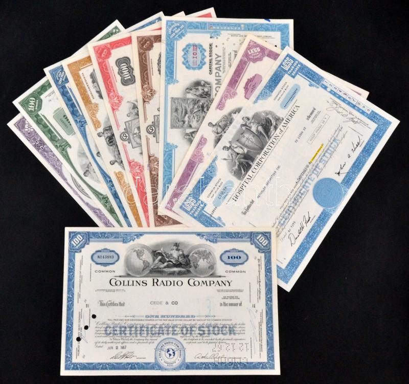 Amerikai Egyesült Államok 1962-1977. 10db klf részvény perforációval, bélyegzésekkel, lyukasztással érvénytelenítve T:I-III USA 1962-1977. 10pcs of diff shares, with perforations, stamps, cancelled by holes C:UNC-F