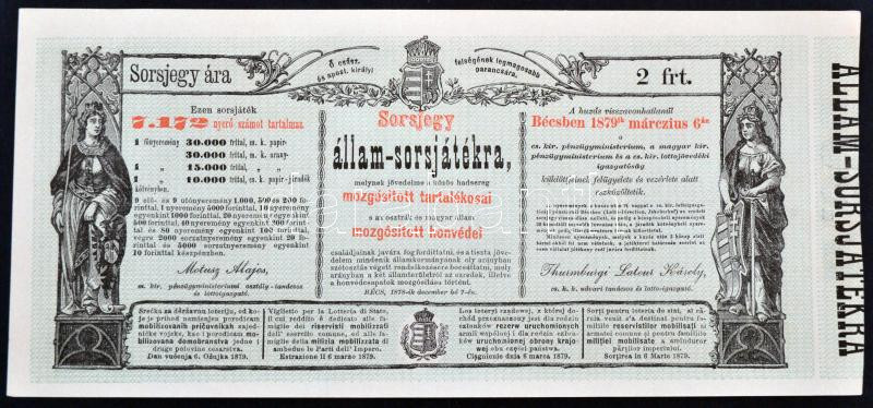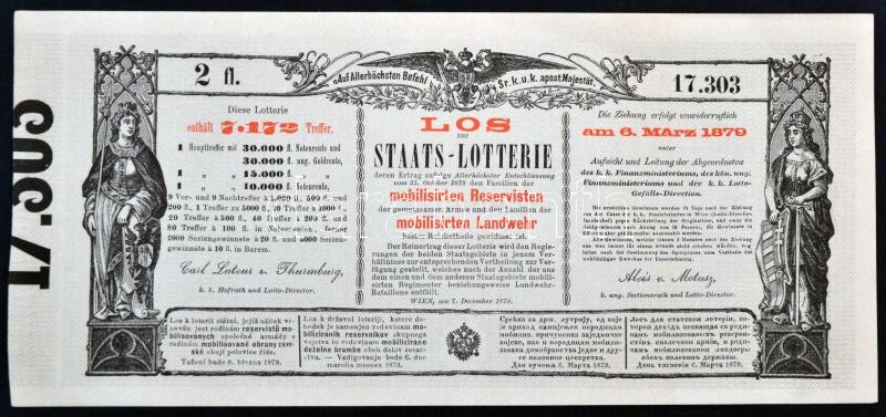 Ausztria / Bécs 1879. "Sorsjegy állam-sorsjátékra a közös hadsereg mozgósított tartalékosai s az osztrák és magyar állam mozgósított honvédei családjai javára" T:I-,II Austria / Vienna 1879. "State Lottery Ticket for the Reservist of the Joint Army and the Families of the mobilized Honved's" C:AU,XF