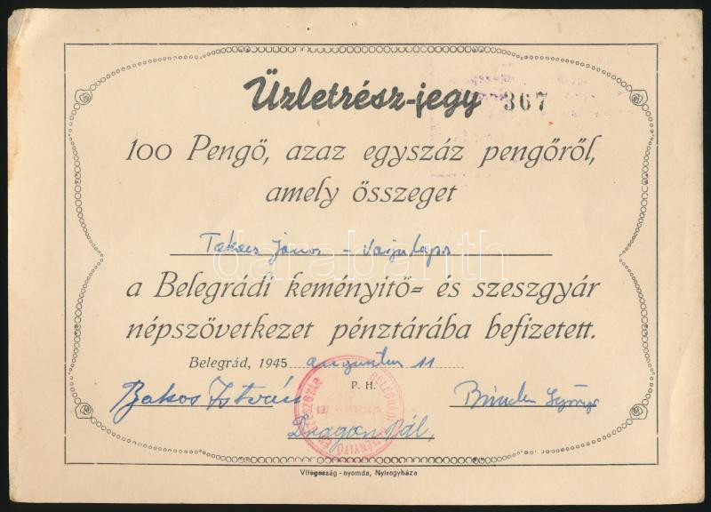 Leírás: Belegrád 1945. "Belegrádi Keményítő- és Szeszgyár Népszövetkezet" 100P üzletrész-jegy, felülbélyegzett T:II- lyuk