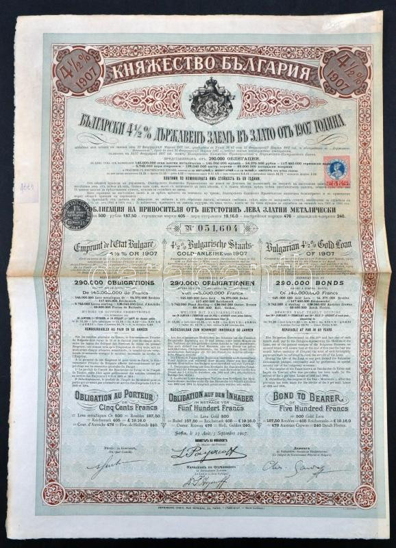 Bulgaria / Sofia 1907. "Bulgarian 4 1/2°Gold Loan" bond about 500 Francs with coupons and overprint C:F