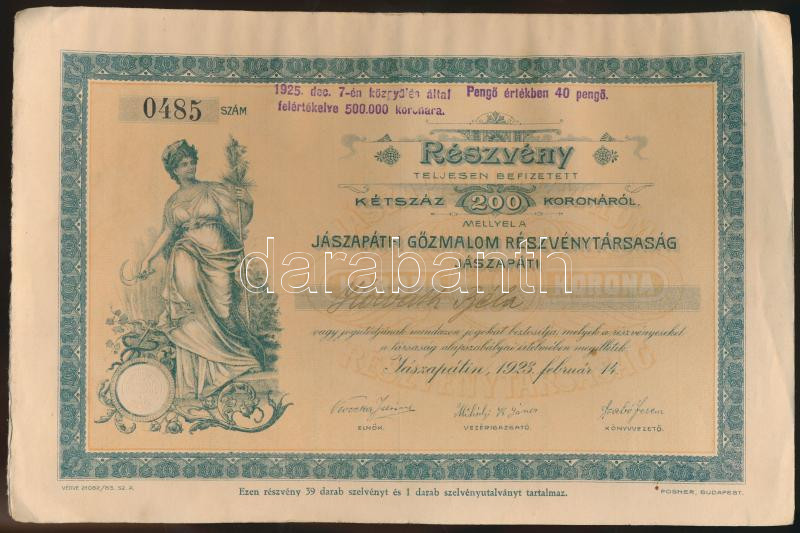 Jászapáti 1923. "Jászapáti Gőzmalom Részvénytársaság" részvé... https://www.darabanth.com/hu/266-Gyorsarveres/266.0/Numizmatika/Reszvenyek-es-sorsjegyek~500005/Jaszapati-1923-Jaszapati-Gozmalom-Reszvenytarsasag-reszvenye-200K-rol-szelvenyekkel-~II1333923