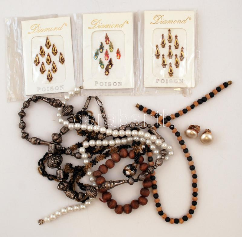 Leírás: Kis bizsu tétel, 5 db nyaklánccal, 1 pár fülklipsszel, 3 lap bindivel
