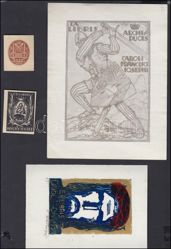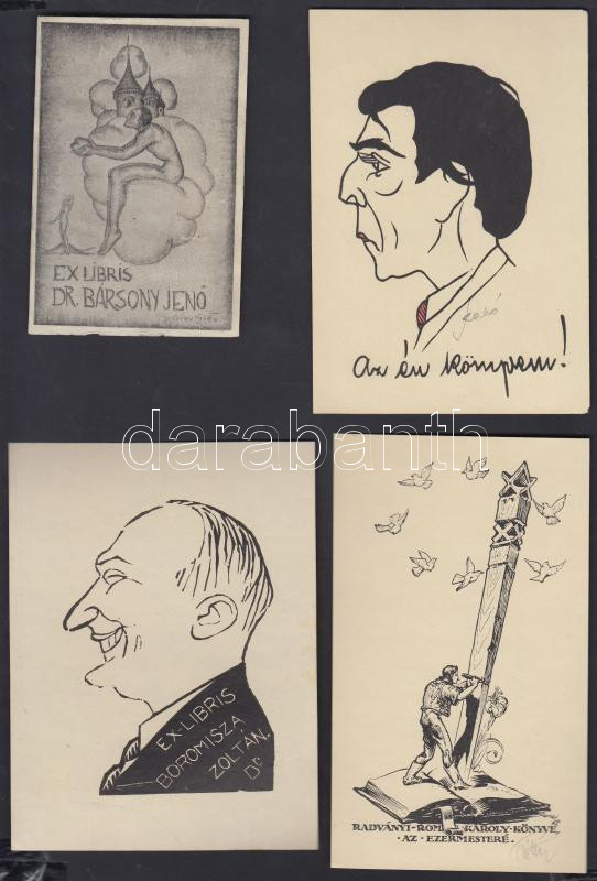 8 db ex libris: Boromisza Tibor, Divéky József, Kozma Lajos, Petry Béla, Radványi Román Károly, Turi Tóth Tibor, klisé, papír, egy részük jelzett, különböző méretben