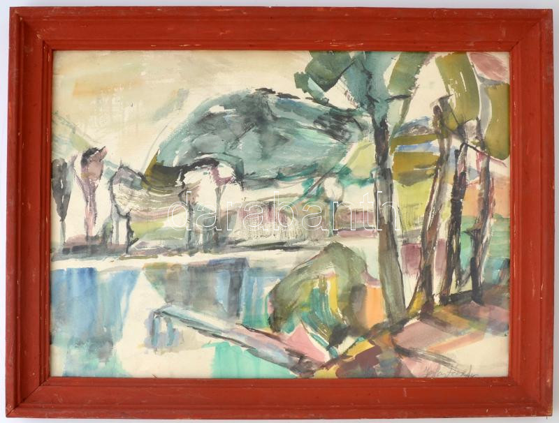 Leírás: Iglay József (1905-1980): Folyópart, akvarell, papír, jelzett, üvegezett fa keretben, 36,5×49,5 cm