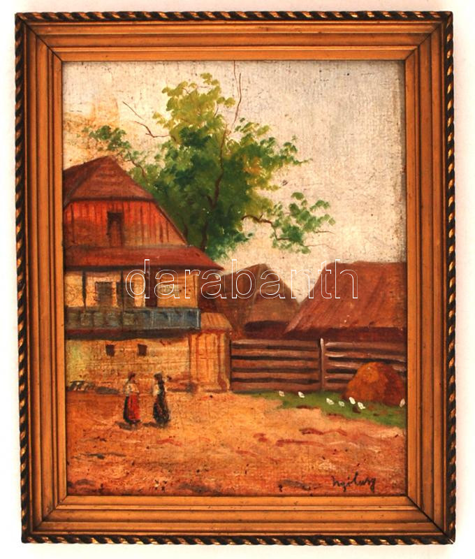 Leírás: Nyilasy jelzéssel: Falusi életkép. Olaj, farost, 27×22 cm