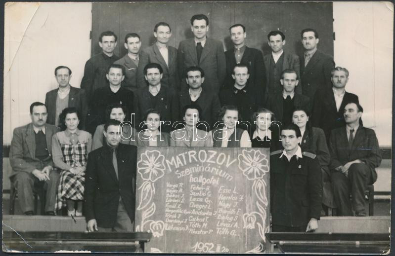 1952 Matrozov szeminárium, fotó, verzón a résztvevők aláírásával, kis ... https://www.darabanth.com/hu/267-Gyorsarveres/267.0/Festmeny-mutargy-papirregiseg-egyeb/Foto~18/1952-Matrozov-szeminarium-foto-verzon-a-resztvevok-alairasaval-kis-tores-nyommal-9x14~II1341409