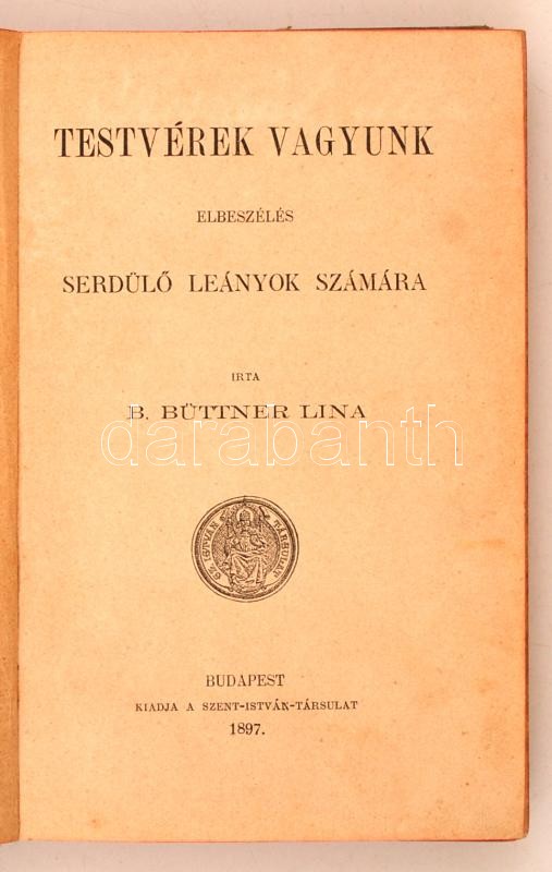 B. Büttner Lina: Testvérek vagyunk. Elbeszélés serdülő leányok számára. Bp., 1897, Szent István Társulat. Megviselt állapotú, gazdagon díszített vászonkötésben.