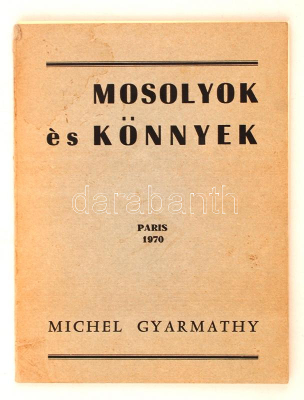 Leírás: Gyarmathy, Michel: Mosolyok és könnyek. Párizs, 1970. Dedikált! Kiadói papírkötés, néhány lap kijár.